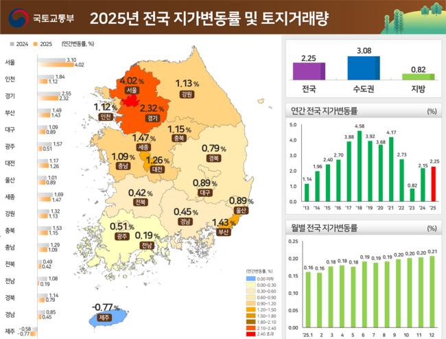 국토교통부와 한국부동산원은 2025년 연간 지가변동률 및 토지거래량을 발표하였다. 2025년 연간 전국 지가는 2.25% 상승하였고, 상승폭은 2024년(2.15%) 대비 0.10%p 확대, 2023년(0.82%) 대비 1.43%p 확대된 것으로 나타났다.