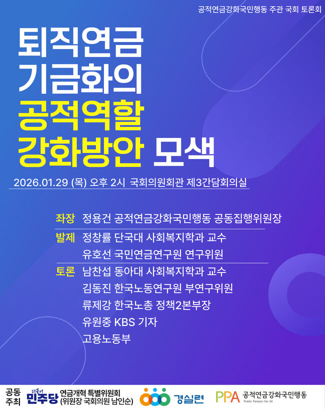 경실련은 '공적연금강화국민행동'과 더불어민주당 '연금개혁특별위원회'와 공동으로 1월 29일(화) 오후 2시 국회의원회관 제3간담회의실에서 <퇴직연금 기금화의 공적역할 강화방안 모색 토론회>를 개최한다.