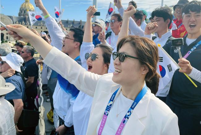 장미란 문화체육관광부 제2차관이 28일(현지시간) 프랑스 파리 앵발리드 양궁장에서 열린 2024 파리올림픽 양궁 여자 단체 결승전에서 대한민국 선수단을 응원하고 있다.