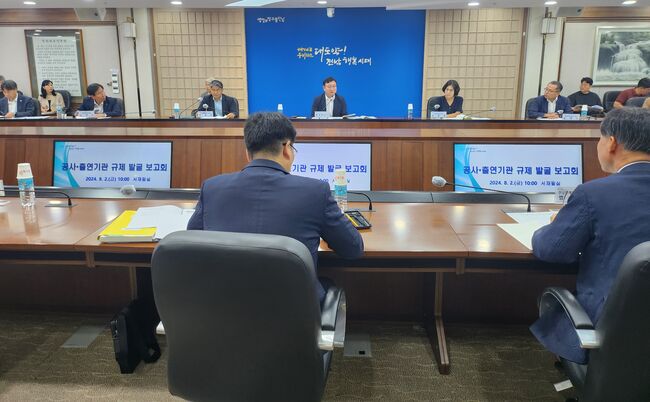 전라남도는 2일 도청 서재필실에서 주민편의와 지역 경제 발전을 저해하는 불합리한 규제를 발굴하고 개선 방안을 논의하기 위해 2024년 공사·출연기관 규제발굴 보고회를 개최했다고 밝혔다.