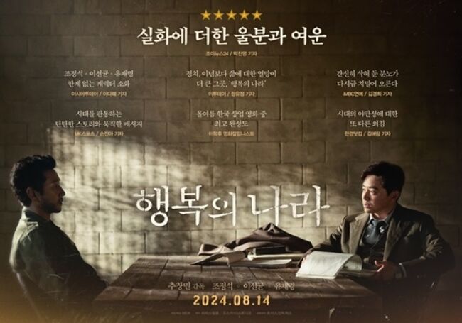'행복의 나라'가 언론·배급시사회 후 이어지는 언론과 평단의 뜨거운 호평을 담은 리뷰 포스터를 공개해 예비 관객들의 기대를 끌어 올린다.