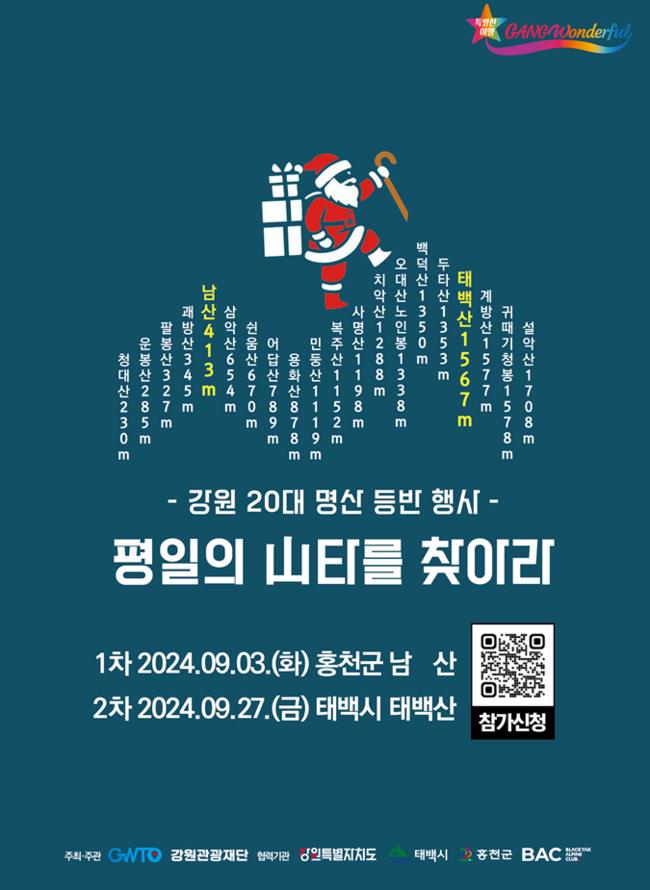 강원특별자치도와 강원관광재단(대표이사 최성현)은 강원 20대 명산 등반 인증 캠페인 사업의 일환으로 ‘평일의 山타를 찾아라’ 행사를 오는 9월 개최한다고 밝혔다.