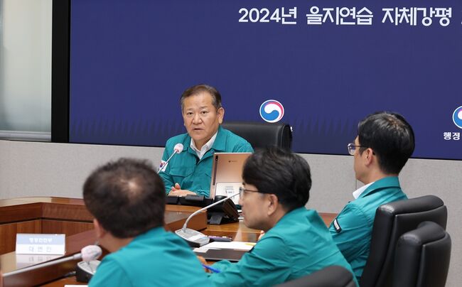 이상민 행정안전부 장관이 23일 오후 서울 종로구 정부서울청사에서 열린 2024년도 을지연습 자체강평 회의에서 발언을 하고 있다.