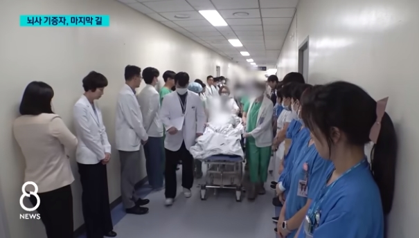 장기기증을 위한 수술실로 향하는 통로에 이 청년을 살리기 위해 필사의 노력을 다했던 서울대의료진들과 직원들이 청년의 마지막 가는 길을 배웅하는 모습이다. 지난해 서울대병원에서 처음 시작했으며 이 행사를 '울림길'이라 부르고 있다.