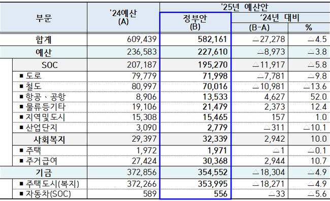 국토교통부'25년 예산안 총괄표 (단위: 억원)