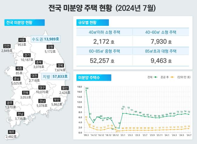 그러나 거래 활성화에도 불구하고, 준공 후 미분양 주택, 이른바 `악성 미분양`은 1년째 증가세를 보이고 있다. 7월 말 기준 전국의 준공 후 미분양 주택은 총 1만 6038호로, 전월 대비 8.0% 증가했다. 수도권에서도 2900호의 준공 후 미분양이 발생했으며, 이는 전월 대비 소폭 증가한 수치다. 서울의 미분양 주택은 953호로 전월 대비 소폭 감소했으나, 여전히 높은 수준을 유지하고 있다.