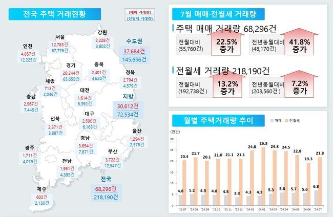 서울뿐만 아니라 수도권 전체의 주택 거래량도 3만 7684건을 기록, 전월 대비 31.3%, 전년 동월 대비 69.9% 증가했다. 전국적으로는 6만 8296건의 주택 매매가 이루어져 전월 대비 22.5%, 전년 동월 대비 41.8% 증가하며, 주택 시장의 전반적인 회복세를 보였다.