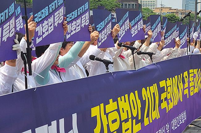 보건복지부는 지난 28일 `간호법`이 국회 본회의를 통과한 만큼, 정부도 진료지원간호사의 업무와 기준, 교육ㆍ운영체계 등에 관한 제도를 신속하게 마련하겠다고 밝혔다. 사진은 지난 5월24일 대한간호협회가 개최한 `용산 대통령실 앞 간호법 제정 촉구 집회` 모습.