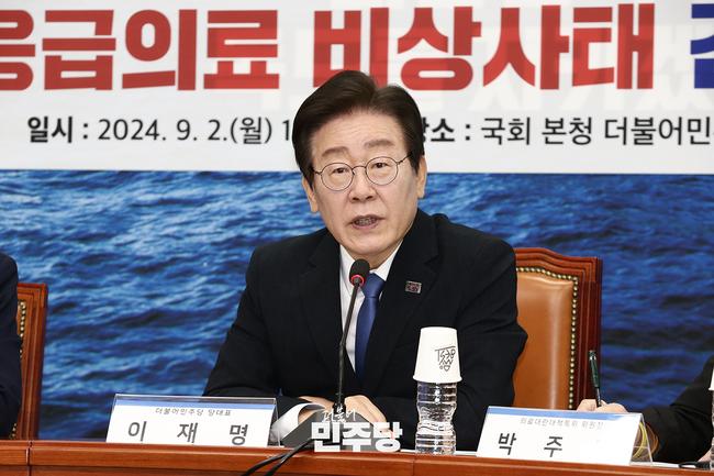 이재명 당대표가 2024.09.02.(월) 국회 본청 당대표회의실에서 열린 의료대란대책특위-대한응급학회 응급의료 비상사태 간담회에 참석하여 모두발언을 하고 있다.