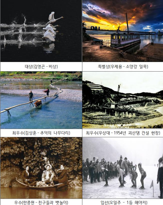 「한강 역사 및 생태·문화 사진전」에서는 김영곤의 '비상', 김상훈의 '추억의 나무다리', 우상대의 '1954년 괴산댐 건설 현장', 우제용의 '소양강 일몰', 한종원의 '친구들과 뱃놀이' 등 한강의 아름다움과 중요성을 표현한 사진 작품을 전시한다.