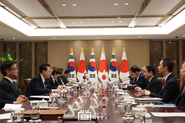 윤석열 대통령이 6일 방한한 「기시다 후미오(岸田文雄)」 일본 총리와 15:35-17:15 약 100분 간 한일 정상회담을 가졌다.