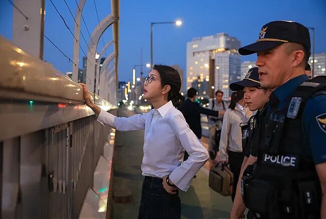 김건희 여사가 서울 마포대교에서 지구대 근무자와 함께 순찰을 하고 있다.