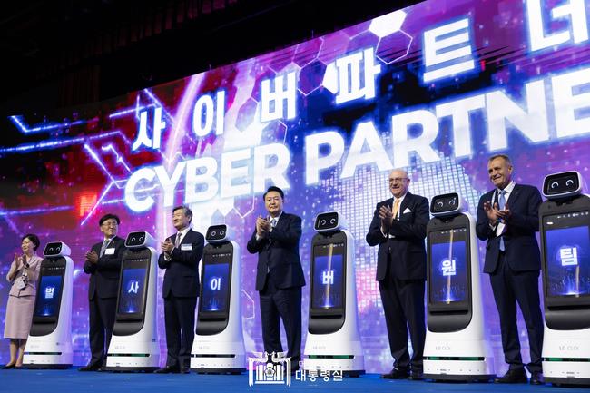 이날 행사에는 20개 기관과 102개 기업이 참여한 민관 협력체 ‘사이버 파트너스’ 출범식이 열렸고, 윤 대통령은 주요 참가국 대사들과 함께 로봇 스크린 세리머니를 진행했다.