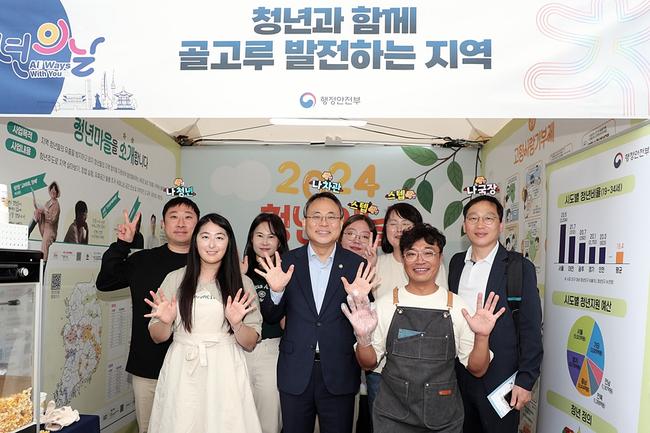 고기동 행정안전부 차관이 21일 오후 서울시 여의도공원에서 열리고 있는 `2024년 청년의 날` 행사장 행정안전부 부스를 찾아 청년마을 관계자들과 기념촬영을 하고 있다. 주거상담소는 대한민국 청년들에게 필요한 주거정보를 쉽게 전달하고 현장에서 청년들의 실제 목소리를 듣기 위해 국토부, 한국토지주택공사(LH) 및 중앙청년지원센터가 협업하여 기획한 것으로 주거관련 정책정보와 상담서비스 등을 패키지로 제공하는 프로그램이다.