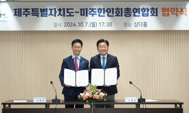 제주특별자치도가 미주한인회총연합회와 국제교류 활성화를 통한 공동의 경제·문화적 발전을 위한 협약을 체결했다.