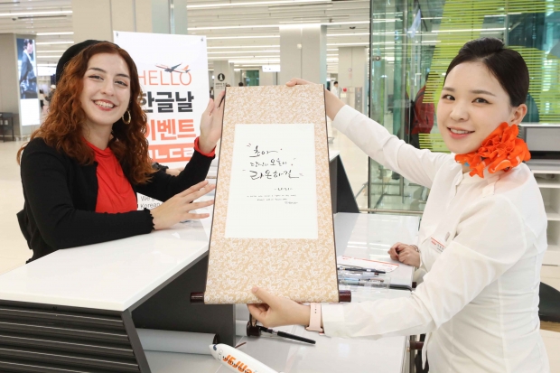 제주항공은 10월7일과 9일, 양일간 오전 9시30분부터 오후 2시까지 김포공항 국내선 청사에서 외국인 탑승객들에게 전통 족자에 한글로 이름을 써주는 손멋글씨 행사를 실시하고, 한국인 탑승객에게는 한글날을 기념해 제주항공에서 제작한 탑승권 모양 엽서에 행복한 여행을 기원하는 좋은 글귀와 이름 등을 손멋글씨로 적어주는 행사도 펼친다.