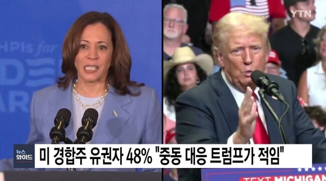 판세를 가를 경합주 유권자들은 외교·안보 분야에서는 트럼프 전 대통령의 손을 들어준 것으로 나타났지만 해리스 부통령에 대한 지지는 한참 낮은 지지율을 기록, 극명한 대조를 보였다.