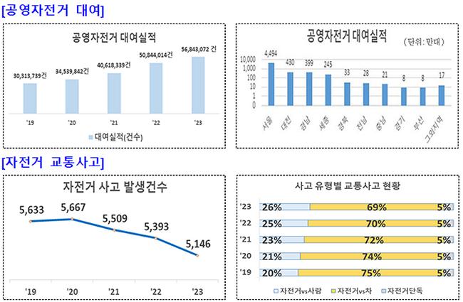 공영자전거 대여실적은 약 5천7백만 건으로 지난해 통계인 2022년 약 5천 1백만 건에 비해 11.8%(약 6백만 건) 증가했으며, 2019년 약 3천만 건에서 약 87.5% 증가(약 2천 1백만 건)했다.