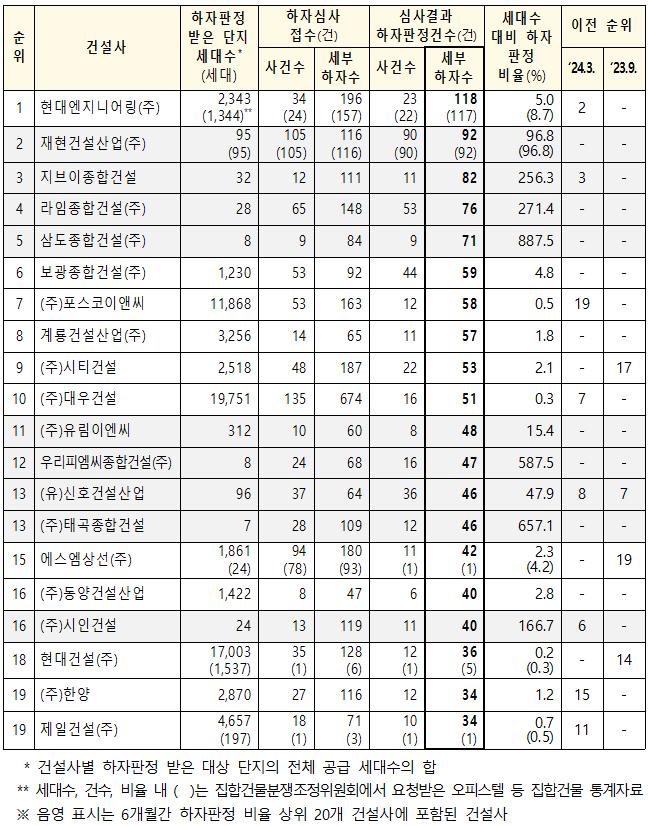 이번에는 지난 두 차례 발표에서 기준으로 삼았던 ‘하자판정 건수’ 외에 ‘하자판정 비율’이 높은 20개 건설사 명단을 추가로 공개하고, 오피스텔 등 집합건물에 대한 하자판정 결과 정보도 별도 제공했다.