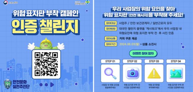 참여 희망자는 ▲공단에서 제작·배포하는 슬로건 및 위험 표지판 ▲공단 누리집에서 내려받은 위험 표지판 시안 ▲자체 제작·구입 위험 표지판 등을 사업장에 부착 후 인증하면 된다.
