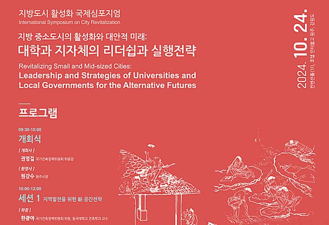 국가건축정책위원회는 국토교통부와 강원특별자치도 원주시)와 공동으로 ‘지방중소도시 활성화와 대안적 미래: 대학과 지자체의 리더쉽과 실행전략’이라는 주제로 국제심포지엄을 개최한다.