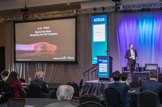 미국 디트로이트에서 열린 글로벌 자동차 기술 전시회 `오토테크 디트로이트 2024`에서 `SDV를 향한 여정`을 주제로 LG 알파웨어를 소개하는 LG전자 VS소프트웨어솔루션팀 발렌틴 자니오트 팀장.