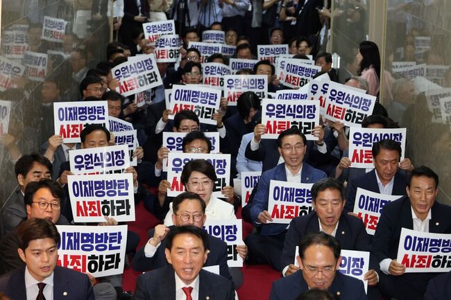 국민의힘은 소속 의원 전원은 본회의 참석을 거부한 채 국회 중앙홀에서 규탄대회를 열고 강하게 반발했다. 추경호 원내대표는 “국회의장이 민주당 의원총회 대변인으로 전락했다. 민주당이 법사위와 운영위, 과방위를 강탈해가려는 건 이재명 대표의 ‘사법 리스크’ 방탄, 대통령 탄핵 정국 조성, 그리고 이를 위한 언론 장악 의도”라고 말했다. 이어진 의원총회에서 그는 ‘우원식 의장 사퇴 촉구 결의안’을 추진하겠다고 밝혔다.