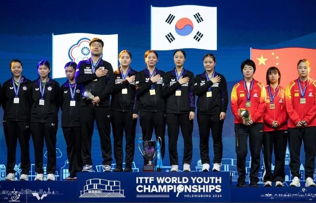 세계청소년탁구선수권에서 첫 우승한 여자 주니어대표팀 시상식 장면