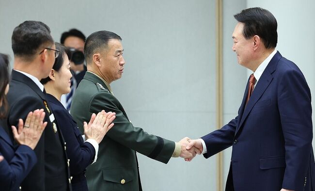 27일 윤석열 대통령은 용산 대통령실에서 중장 진급 및 보직 신고를 받고 삼정검 수치를 수여했다.