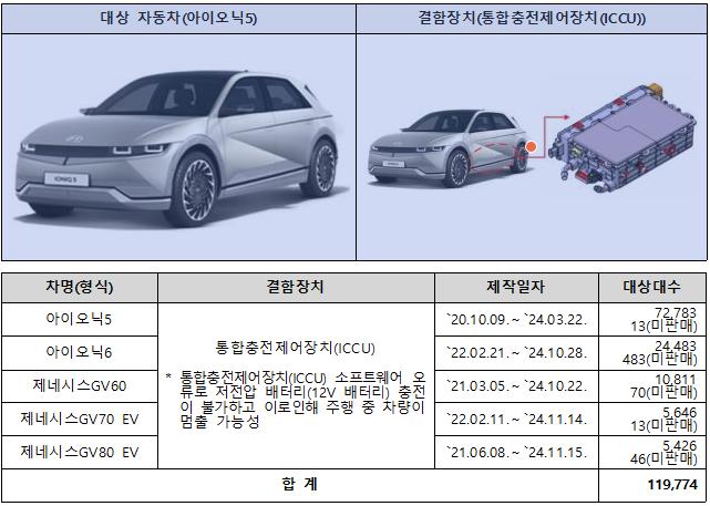 현대자동차 아이오닉5, 아이오닉6 등 5개 차종 11만 9,774대는 통합충전제어장치(ICCU) 소프트웨어 오류로, 포터2 EV 2만 9,115대는 프로펠러 샤프트 설계 오류로 리콜 대상에 포함됐다.