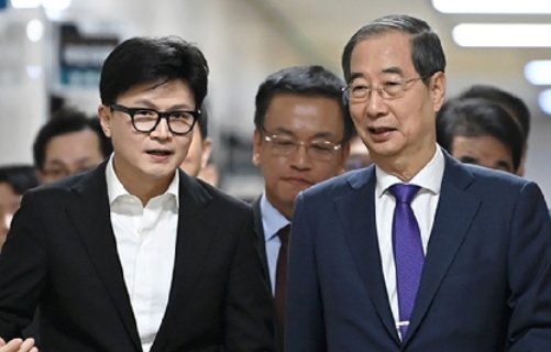 한동훈 국민의힘 대표와 한덕수 국무총리가 8일 윤석열 대통령의 임기 단축을 위한 '질서 있는 퇴진' 로드맵 등 국정 수습 방안을 논의할 예정이다. 두번째 회동은 이날 오전 11시 여의도 국민의힘 중앙당사에서 이뤄진다.