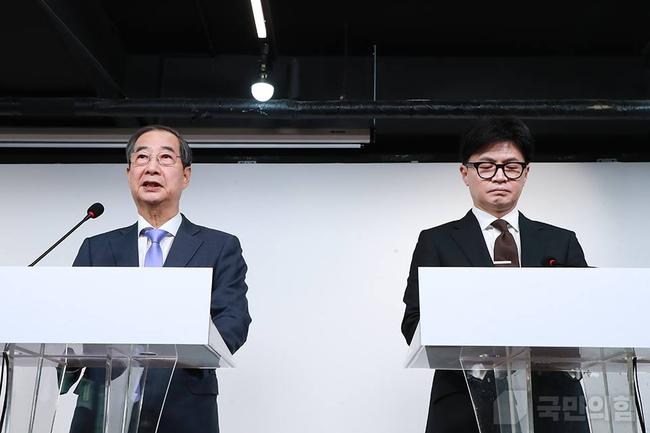 한덕수 국무총리와 한동훈 국민의힘 대표가 8일 오전 서울 여의도에 위치한 국민의힘 중앙당사에서 대국민 공동 담화를 발표하고 있다.
