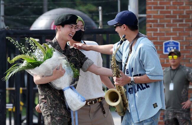 이날 ‘특급 전사’ 마크가 박힌 전투복 차림의 진은 경기 연천군 5사단 신병교육대에서 동료 장병들의 박수를 받은 뒤 위병소를 나왔고, 팬과 취재진을 향해 거수경례를 했다. 슈가를 제외한 BTS 멤버 RM, 제이홉, 뷔, 정국, 지민도 이날 현장을 찾아 진의 전역을 축하했다.