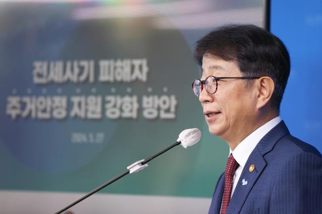 박상우 국토부장관이 지난 5월 27일 전세사기 피해자 주거안정 지원 강화방안을 발표하고 있다.