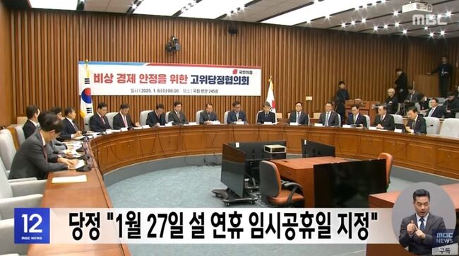 국민의힘 김상훈 정책위의장은 "당정은 설 연휴 기간 내수 경기 진작과 관광 활성화를 도모하기 위해 2025년 1월 27일을 임시 공휴일로 지정하는 것으로 협의했다"고 말했다.