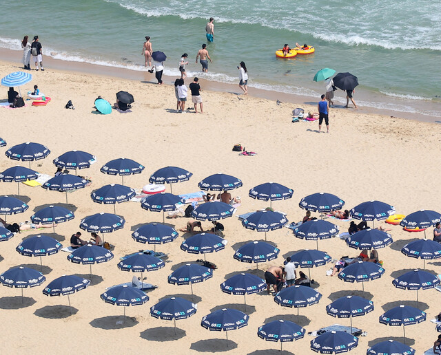 • 부산의 한낮 기온이 35도 가까이 치솟은 19일 오후 부산 해운대해수욕장에서 시민들이 물놀이를 즐기고 있다. 해운대해수욕장은 통상 정식 개장하는 7월에 파라솔 대여가 시작되지만 올해부터 …