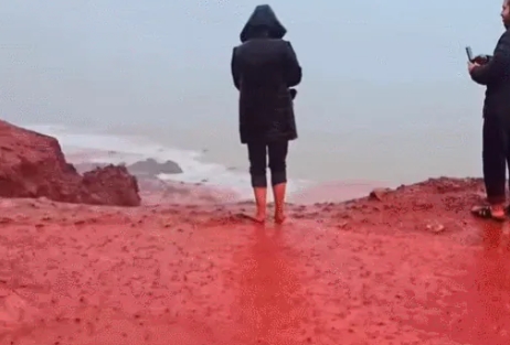 바다는 물론 몰아치는 세찬 파도까지 핏빛인 데다, 빗물에 패인 토양까지 검붉은색을 띠고 있다.