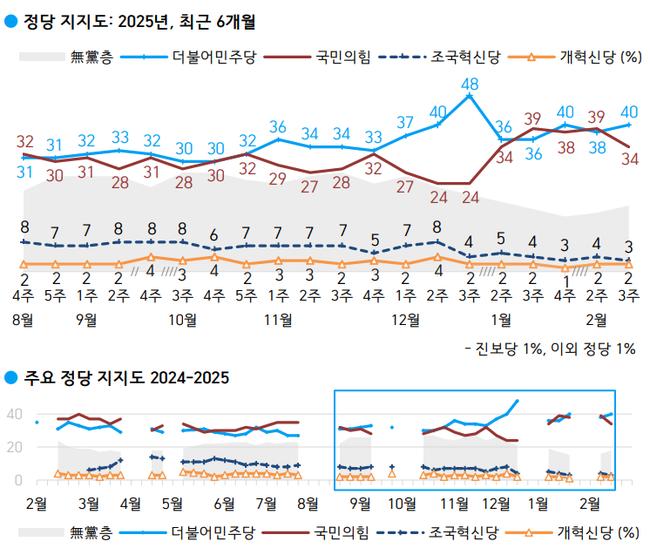 정당 지지도는 더불어민주당 40%, 국민의힘 34%로 집계됐으며, 차기 정치 지도자 선호도 조사에서는 이재명 대표가 34%로 가장 높은 지지를 받았다.