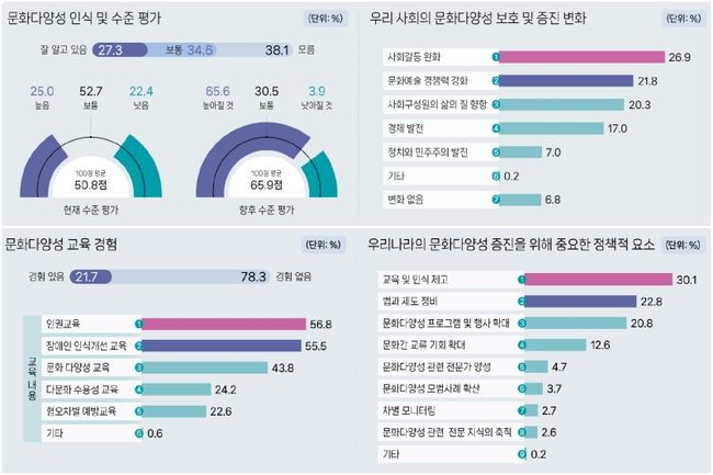 조사 결과, 국민의 27.3%만이 문화다양성에 대해 잘 알고 있다고 응답했다. 우리 사회의 문화다양성 수준은 100점 만점 기준 50.8점으로 평가됐으며, 5년 후에는 65.9점으로 상승할 것으로 전망됐다. 문화다양성이 높아지면 사회 갈등 완화(26.9%), 문화예술 경쟁력 강화(21.8%), 삶의 질 향상(20.3%)에 기여할 것이라는 인식이 조사됐다.