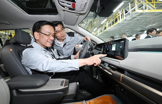최상목 부총리 겸 기획재정부 장관이 지난 6월 21일 전기차산업 현장인 기아 오토랜드 광명을 방문, 전기차에 탑승해 송호성 사장으로부터 설명을 듣고 있다.