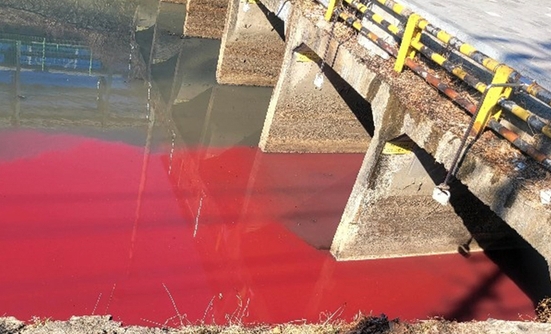 분홍 빛을 띠는 폐수가 무단 방류되고 있는 모습.
