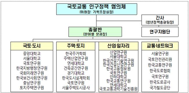 논의의 효율성을 위해 ①국토‧도시, ②주택‧토지, ③산업‧일자리, ④교통‧네트워크 등 4개 분과로 구분되며 분야별 분과장이 참여하는 총괄반에서 전체방향을 조율하고, 국토연구원에서 연구지원을 담당한다.