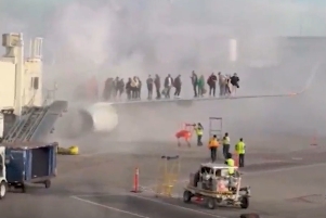 아메리칸항공 승객들이 비행기 날개 위에서 구조를 기다리고 있다.