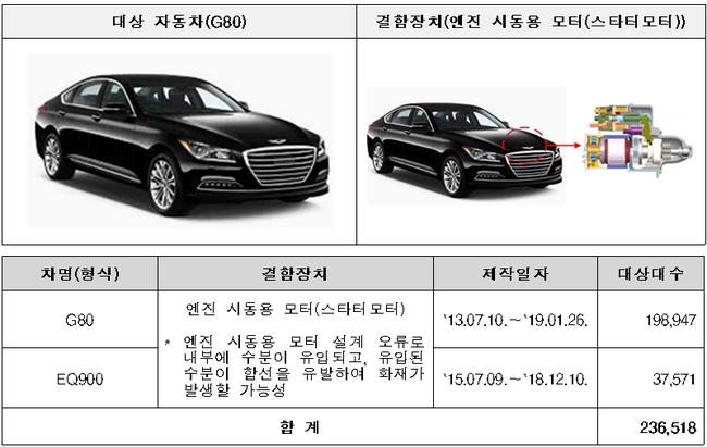 현대 G80 등 2개 차종 236,518대는 엔진 시동용 모터 설계 오류로 화재가 발생할 가능성으로, 맥스크루즈 등 2개 차종 37,169대는 전자제어유압장치(HECU) 내구성 부족으로 화재가 발생할 가능성으로 6월 27일부터 시정조치에 들어간다.