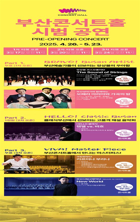 2차 티켓 예매 개시일은 오는 20일 오전 11시며, 부산콘서트홀 공식 누리집(https://classicbusan.busan.go.kr)에서 회원가입 후 선착순 1인(아이디) 4매까지, 무료 참관 신청이 가능하다. 3차 티켓 예매는 3월 24일 오전 11시부터 가능하다. 기타 자세한 사항은 클래식부산 공연기획팀(☎051-640-8825)으로 문의하면 된다.
