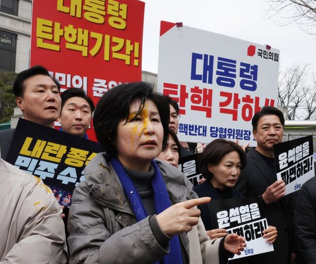 20일 탄핵촉구 기자회견 중 계란 맞은 민주당 백혜련 의원