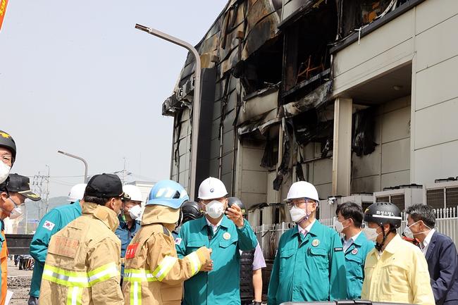 이상민 행정안전부 장관이 지난 24일 경기도 화성시 서신면 소재 일차전지 제조 업체 공장의 화재 현장을 찾아 소방관들의 화재진압 활동 상황 등을 점검하고 있다.