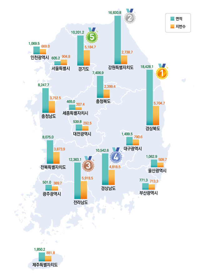 전국 17개 광역자치단체 중 면적이 큰 순서는 경북 18,428.1㎢(18.3%), 강원 16,830.8㎢(16.8%), 전남 12,363.1㎢(12.3%)으로 나타났다. 작은 순서로는 세종 465.0㎢(0.5%), 광주 501.0㎢(0.5%), 대전 539.8㎢(0.5%) 순이다.