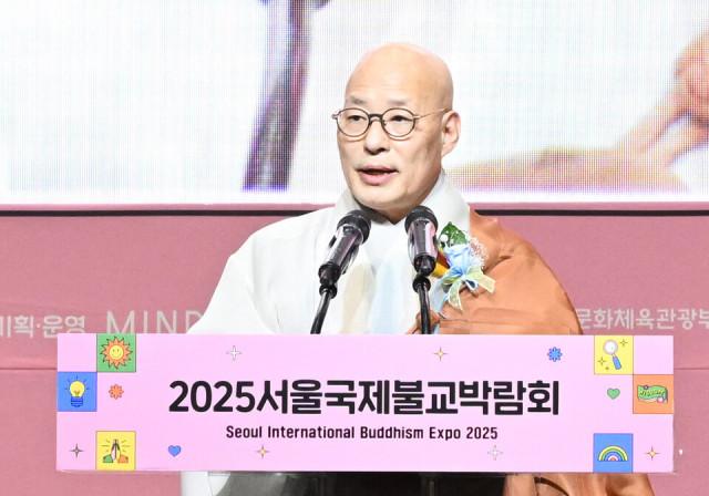 2025서울국제불교박람회 개막식에서 대한불교조계종 총무원장 진우 스님이 대회사를 하고 있다
