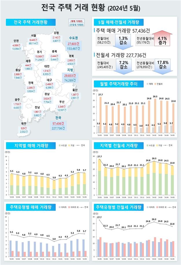 5월 주택 매매거래량(신고일 기준)은 총 57,436건으로, 전월 대비 1.3% 감소했고, 전월세 거래량(신고일 기준)은 총 227,736건으로, 전월 대비 7.2% 감소했다.